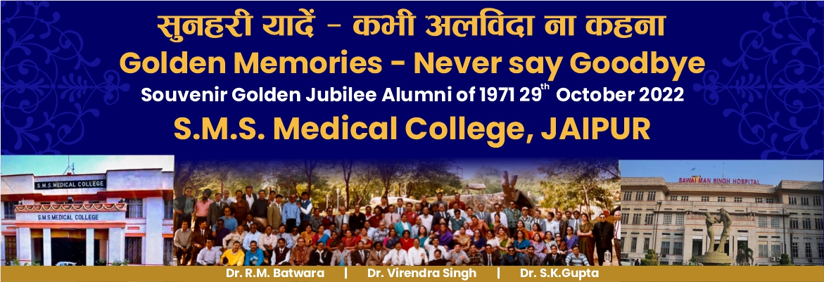 Alumni-71 is the most versatile batch, SMS Medical College, Jaipur ever had. Started with an initial head count of 150, its strength soon swelled up to 180. After qualifying, many of the alumni left India, excelled themselves in various fields of Medicine/business and have bought laurels to SMS and our country. Other joined Medical colleges in various parts of country/established their own hospitals and excelled in their respective specialties.